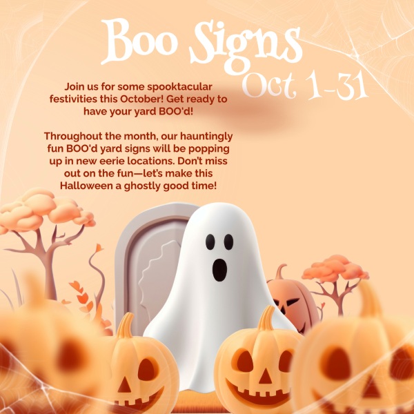 We are excited to announce the opportunity to sign up for this year's Boo yard sign! If you are interested, please follow the link below to register. Click Full Story for more information.